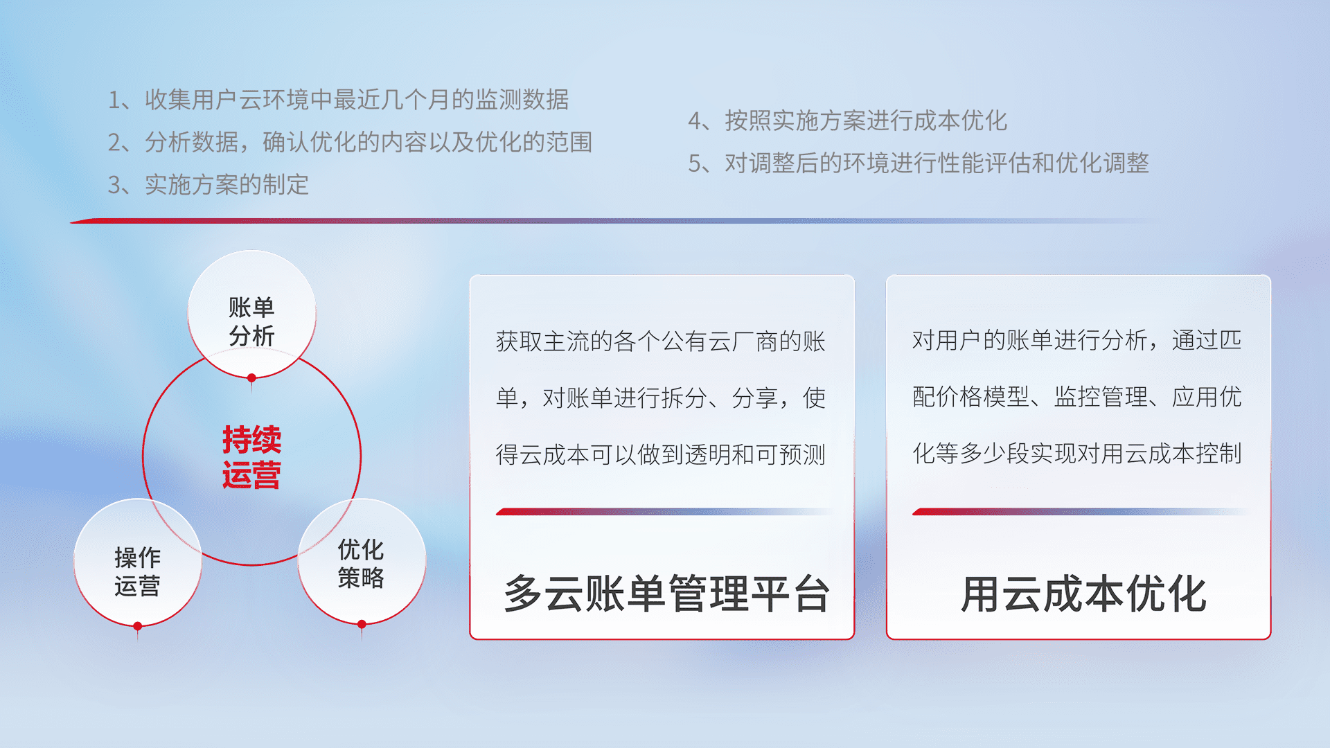 通过多云纳管,,,以统一的资源数据模型把客户的云资源进行抽象和封装,,进而实现对多云资源的统一操作,,,保障云资源管理的可靠性、、、、稳定性与可用性。。。。量身定制化运维内容,,配置、、开发运维、、补丁管理、、、、备份、、监控、、认证和访问管理、、、、审计和日常巡检等,,,,保障在用云过程中的可靠度,,,,稳定度以及高可用率。。。。