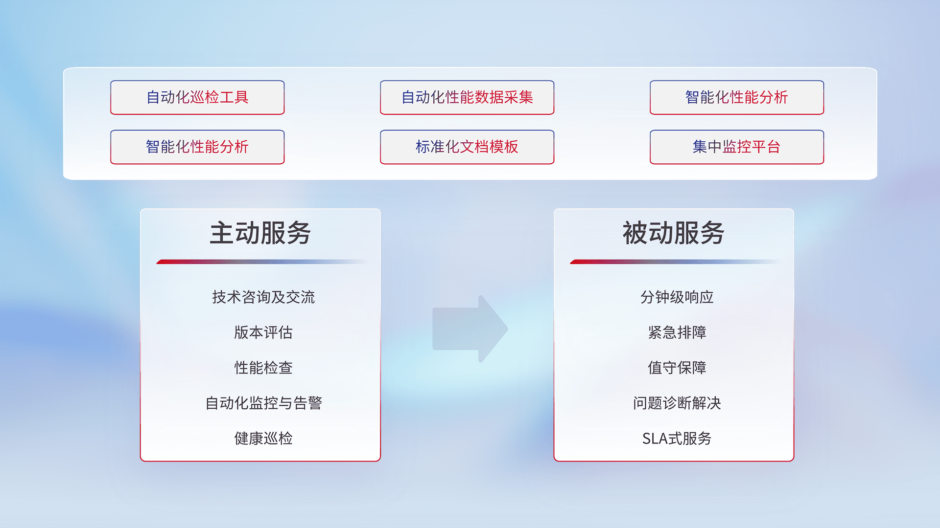 智能化工具和标准化文档,,保障服务质量,,提供主动服务(包含技术咨询、、、版本评估、、性能检查、、、自动化监控与告警、、、、健康巡检)和被动服务包含(分钟级响应、、紧急排障、、、值守保障、、、、问题诊断解决、、SLA服务)。。。。